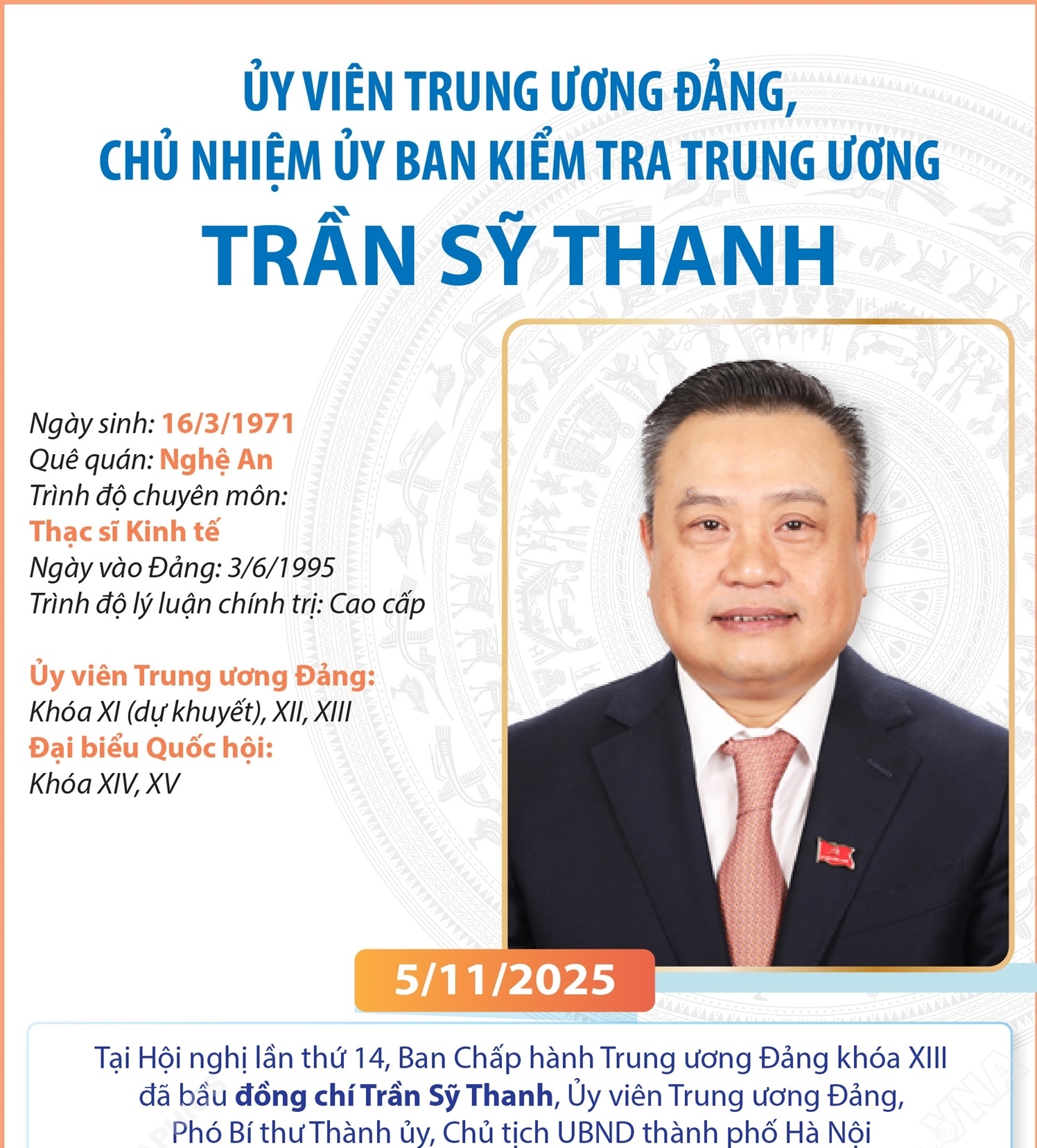 Hà Nội (TTXVN 5/11) Ngày 5/11/2025, tại Hội nghị lần thứ 14, Ban Chấp hành Trung ương Đảng khóa XIII đã bầu đồng chí Trần Sỹ Thanh, Ủy viên Trung ương Đảng, Phó Bí thư Thành ủy, Chủ tịch UBND thành phố Hà Nội tham gia Ủy ban Kiểm tra Trung ương và giữ chức Chủ nhiệm Ủy ban Kiểm tra Trung ương khóa XIII.