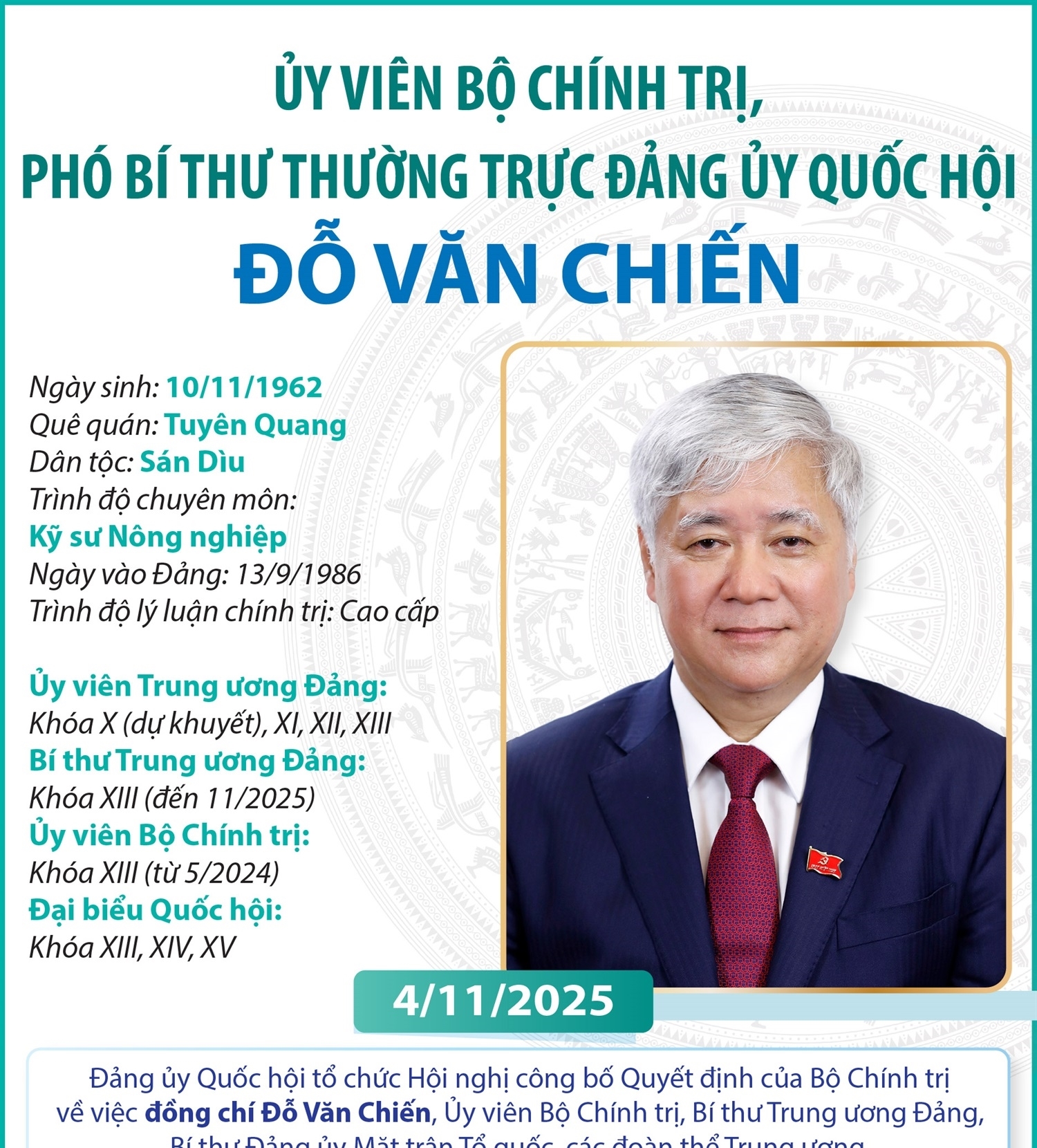 Hà Nội (TTXVN 4/11) Sáng 4/11/2025, tại Nhà Quốc hội, Tổng Bí thư Tô Lâm dự Lễ công bố quyết định của Bộ Chính trị về nhân sự Phó Bí thư Thường trực Đảng ủy Quốc hội. Bộ Chính trị quyết định: Đồng chí Đỗ Văn Chiến, Ủy viên Bộ Chính trị, Bí thư Trung ương Đảng, Bí thư Đảng ủy Mặt trận Tổ quốc, các đoàn thể Trung ương, Chủ tịch Ủy ban Trung ương Mặt trận Tổ quốc Việt Nam thôi tham gia Ban Bí thư khóa XIII, thôi tham gia Ban Chấp hành, Ban Thường vụ Đảng ủy, thôi giữ chức Bí thư Đảng ủy Mặt trận Tổ quốc, các đoàn thể Trung ương; điều động, phân công, chỉ định tham gia Ban Chấp hành, Ban Thường vụ Đảng ủy và giữ chức Phó Bí thư Thường trực Đảng ủy Quốc hội.