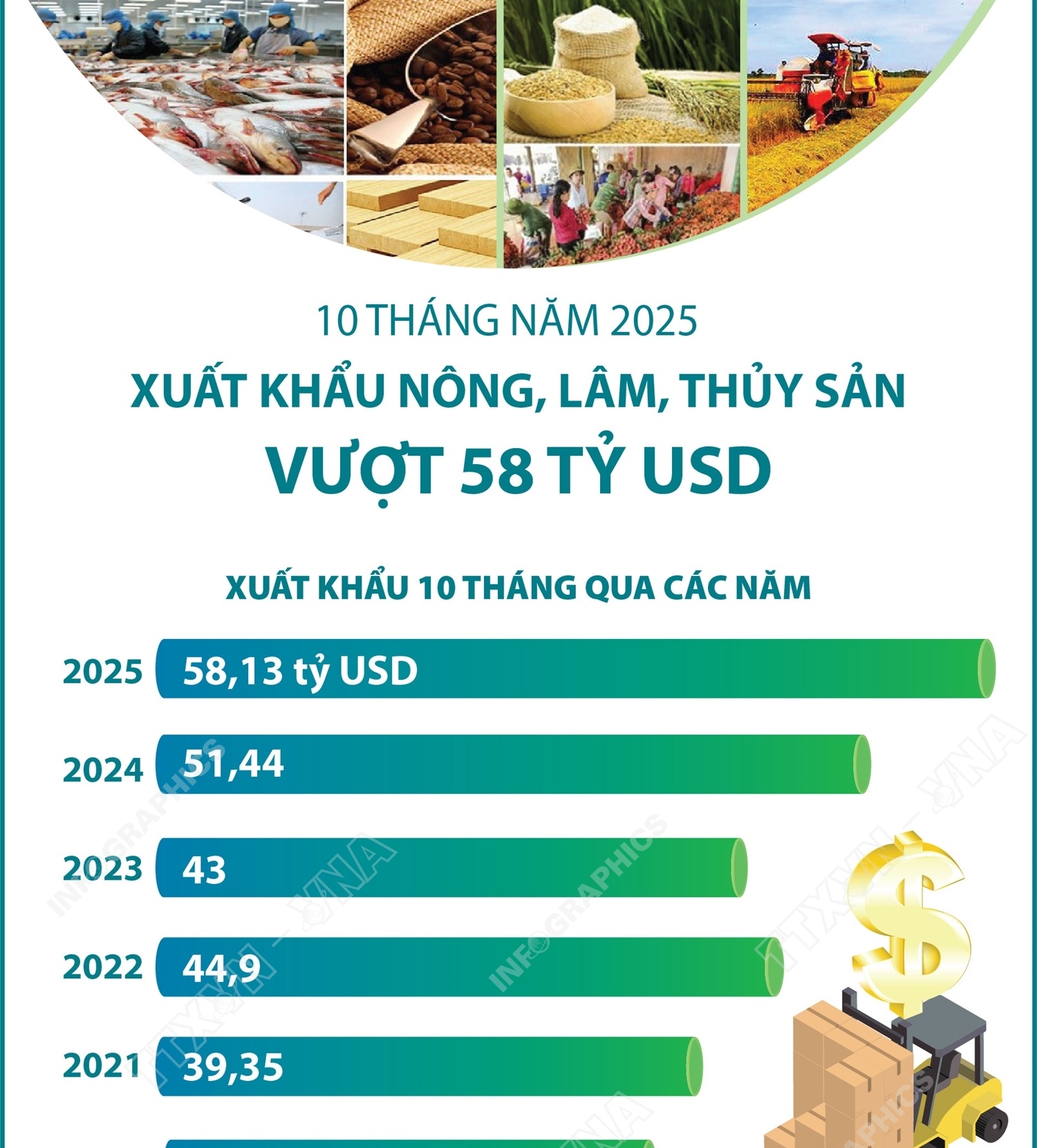 Hà Nội (TTXVN 5/11) Theo báo cáo của Bộ Nông nghiệp và Môi trường, xuất khẩu nông, lâm, thủy sản của Việt Nam trong 10 tháng năm 2025 đạt 58,13 tỷ USD, tăng gần 13% so với cùng kỳ năm 2024. Theo đó, động lực tăng trưởng đến từ nhóm cà phê đạt 7,41 tỷ USD, tăng gần 62%; rau quả đạt 7,09 tỷ USD, tăng 15%; lâm sản và gỗ đạt gần 15 tỷ USD, tăng gần 5,4% và thủy sản đạt 9,31, tăng khoảng 13% so với cùng kỳ năm 2024.