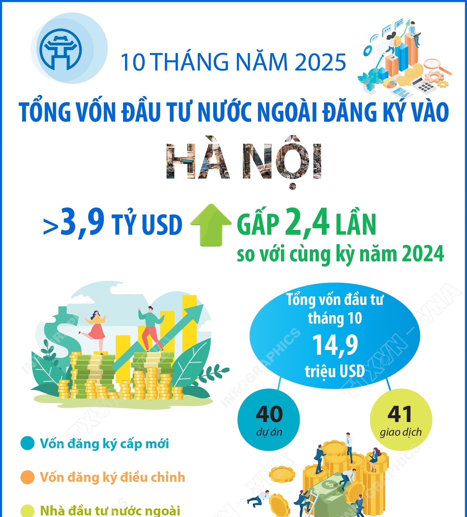 Hà Nội (TTXVN 5/11) 10 tháng năm 2025, tổng vốn đầu tư nước ngoài đăng ký vào Hà Nội đạt hơn 3,9 tỷ USD, gấp 2,4 cùng kỳ năm 2024. Trong đó, đăng ký cấp mới 342 dự án với số vốn đạt 316,7 triệu USD; 120 dự án điều chỉnh tăng, giảm vốn đăng ký đạt 3.215 triệu USD; 318 lượt nhà đầu tư nước ngoài góp vốn, mua cổ phần đạt 375,3 triệu USD.