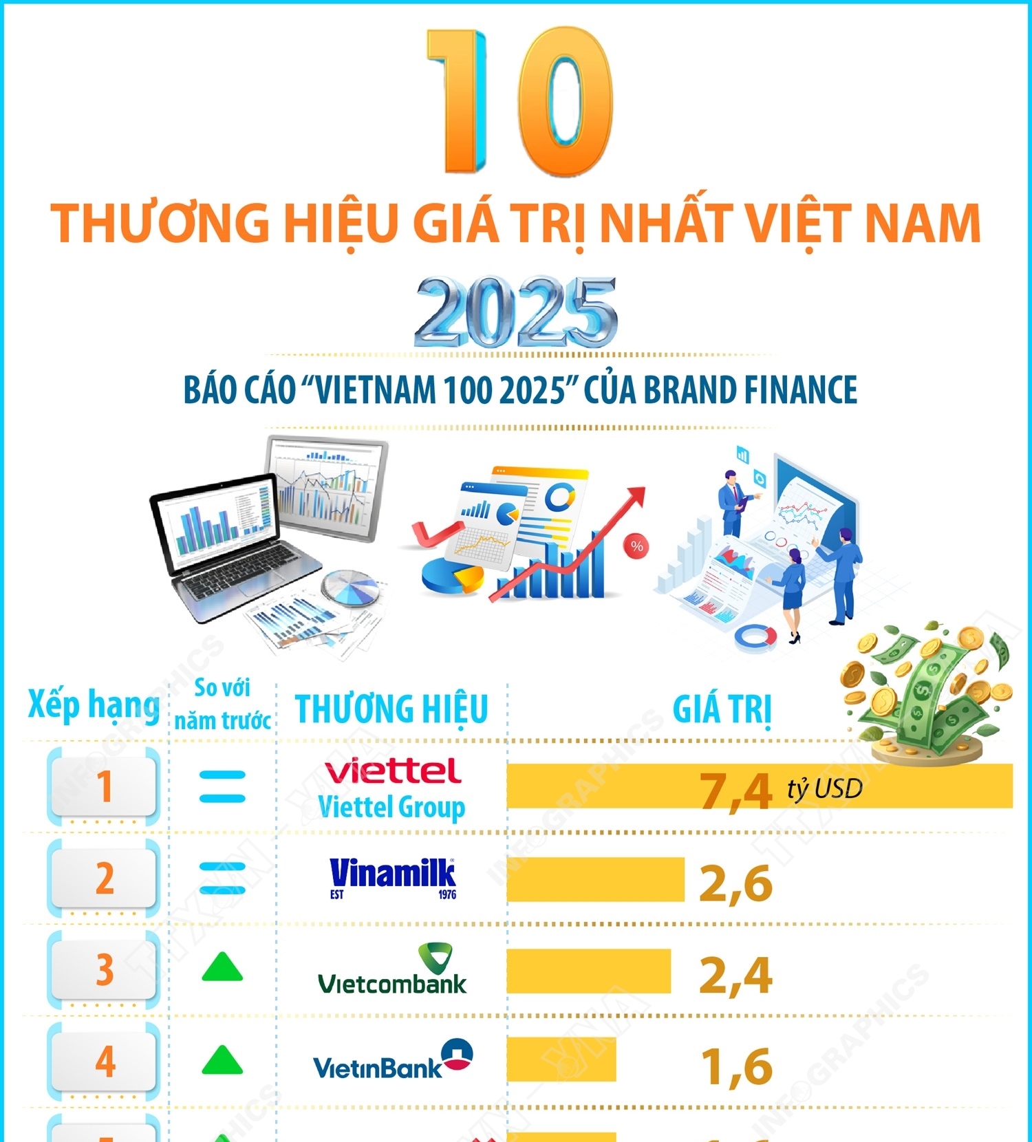 Hà Nội (TTXVN 5/11) Báo cáo “Vietnam 100 2025” của Brand Finance cho biết tổng giá trị thương hiệu của 100 thương hiệu hàng đầu Việt Nam năm 2025 đạt 38,4 tỷ USD. Các thương hiệu hàng đầu Việt Nam vượt qua thách thức kinh tế nhờ chuyển đổi số và tăng trưởng ngành. 10 thương hiệu giá trị hàng đầu năm 2025 gồm có: Viettel Group, Vinamilk, Vietcombank, Vietinbank, Techcombank, BIDV, Vinhomes, MBBank, Agribank và FPT.
