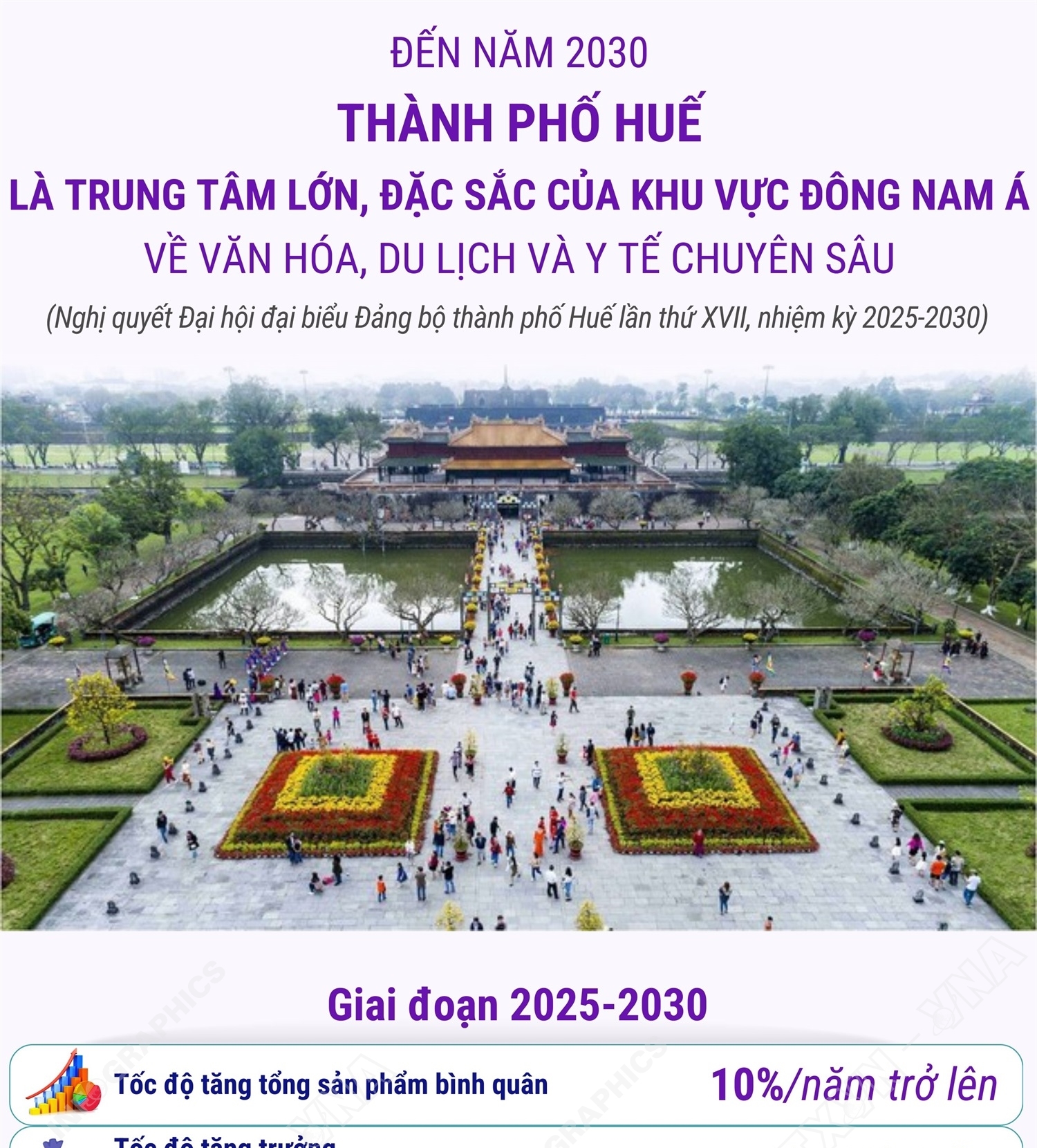 Hà Nội (TTXVN 7/11) Đại hội Đại biểu Đảng bộ thành phố Huế lần thứ XVII đã thông qua Nghị quyết Đại hội, trong đó đặt ra mục tiêu: “Xây dựng Đảng bộ và hệ thống chính trị trong sạch, vững mạnh; phát huy sức mạnh toàn dân; huy động và sử dụng có hiệu quả các nguồn lực, xây dựng, phát triển thành phố Huế đến năm 2030 là đô thị di sản đặc trưng của Việt Nam, một trong những trung tâm lớn, đặc sắc của khu vực Đông Nam Á về văn hóa, du lịch và y tế chuyên sâu; một trong những trung tâm lớn của cả nước về khoa học và công nghệ, giáo dục và đào tạo đa ngành, đa lĩnh vực, chất lượng cao; trung tâm kinh tế biển mạnh của cả nước; quốc phòng, an ninh được bảo đảm vững chắc; đời sống vật chất và tinh thần của người dân đạt mức cao”. Thành phố Huế phấn đấu giai đoạn 2025-2030, tốc độ tăng tổng sản phẩm bình quân từ 10%/năm trở lên; tốc độ tăng trưởng vốn đầu tư thực hiện bình quân 10 -11%/năm; tốc độ tăng trưởng thu ngân sách bình quân 14-15%/năm; kim ngạch xuất khẩu tăng bình quân 10-12%/năm; tỷ lệ đô thị hóa đạt 70%. Đến năm 2030 tổng sản phẩm bình quân đầu người từ 5.800-6.000 USD; cơ bản không còn hộ nghèo…