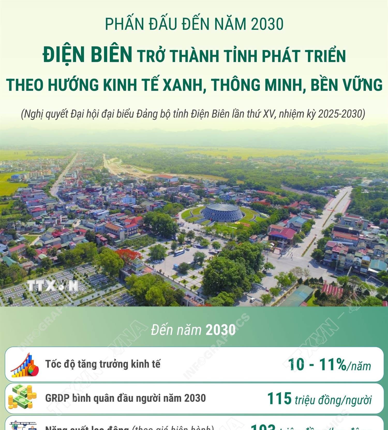 Hà Nội (TTXVN 7/11) Đại hội Đại biểu Đảng bộ tỉnh Điện Biên lần thứ XV, nhiệm kỳ 2025-2030 đã thông qua Nghị quyết Đại hội, nhất trí mục tiêu, định hướng chiến lược phát triển và nhiệm vụ, giải pháp nhiệm kỳ 2025-2030. Mục tiêu tổng quát là tiếp tục nâng cao năng lực lãnh đạo, sức chiến đấu của Đảng bộ; phát huy sức mạnh đại đoàn kết toàn dân tộc; khai thác hiệu quả tiềm năng, lợi thế, đẩy mạnh phát triển kinh tế - xã hội. Chú trọng phát triển hạ tầng y tế, giáo dục, đào tạo và đổi mới sáng tạo; không ngừng nâng cao chất lượng công tác chăm sóc sức khỏe cho nhân dân. Nâng cao chất lượng công tác đào tạo nguồn nhân lực. Phát triển nông, lâm nghiệp ứng dụng khoa học, công nghệ hiện đại; kết hợp với phát triển công nghiệp chế biến và dịch vụ, du lịch. Đẩy mạnh phát triển kinh tế số và hệ thống kết cấu hạ tầng kinh tế - xã hội. Giữ vững ổn định chính trị, bảo đảm quốc phòng - an ninh, bảo vệ vững chắc chủ quyền lãnh thổ quốc gia; mở rộng đối ngoại và hội nhập quốc tế. Phấn đấu đến năm 2030, đưa Điện Biên trở thành tỉnh phát triển theo hướng kinh tế xanh, thông minh, bền vững; là một trong những trung tâm du lịch của vùng; trở thành tỉnh phát triển khá trong khu vực.
