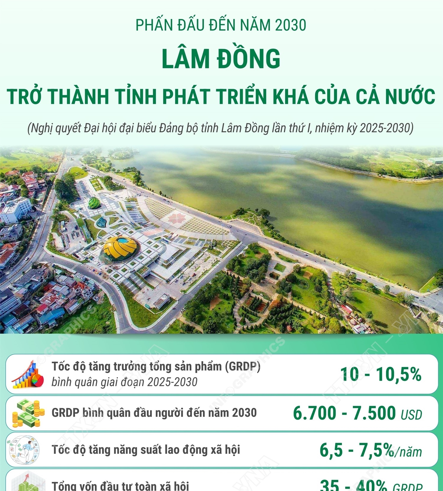 Hà Nội (TTXVN 7/11) Đại hội Đại biểu Đảng bộ tỉnh Lâm Đồng lần thứ I, nhiệm kỳ 2025-2030 đã thông qua Nghị quyết Đại hội, nhất trí mục tiêu, định hướng chiến lược phát triển và nhiệm vụ, giải pháp nhiệm kỳ 2025-2030. Đại hội xác định mục tiêu đến năm 2030, xây dựng Lâm Đồng trở thành tỉnh phát triển khá của cả nước, là một trong những cực tăng trưởng năng động của khu vực… Phấn đấu tốc độ tăng trưởng tổng sản phẩm trên địa bàn (GRDP) bình quân giai đoạn 2025-2030 khoảng 10 - 10,5%; trong đó khu vực nông, lâm và thủy sản tăng 5 - 5,5%/năm; khu vực công nghiệp - xây dựng tăng 14,5 - 15,5%/năm; khu vực dịch vụ tăng 11 - 11,5%/năm. Đến năm 2030, GRDP bình quân đầu người đạt từ 6.700 - 7.500 USD, tổng vốn đầu tư toàn xã hội chiếm 35 - 40% GRDP. Chỉ số phát triển con người (HDI) phấn đấu đạt khoảng 0,75; đến năm 2030 (theo chuẩn nghèo đa chiều giai đoạn 2026-2030) cơ bản không còn hộ nghèo…