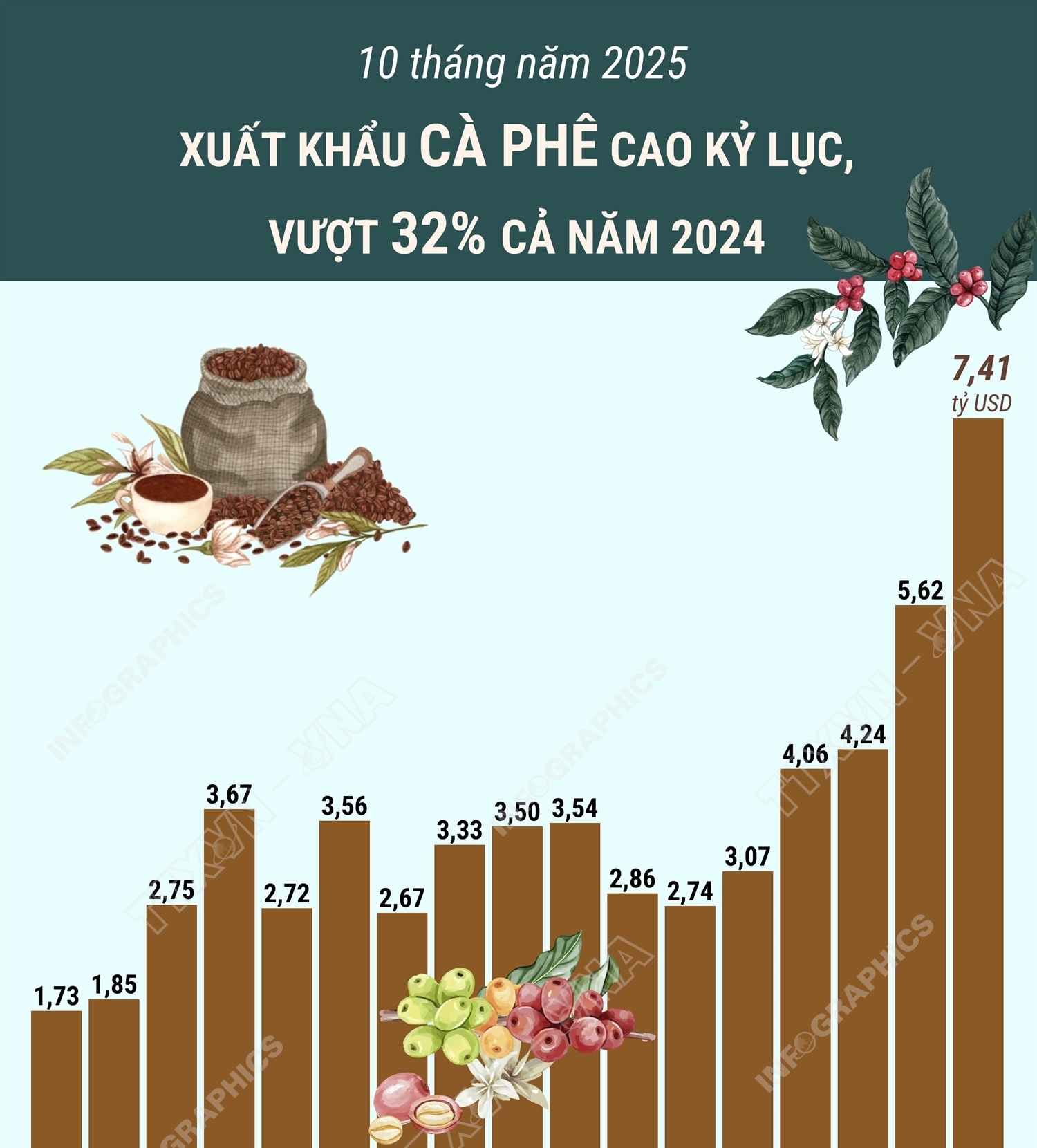 Hà Nội (TTXVN 5/11) Cà phê tiếp tục là điểm sáng nổi bật của xuất khẩu nông sản Việt Nam trong 10 tháng/2025 khi mang về 7,41 tỷ USD, tăng gần 62% so với cùng kỳ năm 2024, mức tăng cao nhất trong nhóm hàng nông sản chủ lực. Giá trị xuất khẩu cà phê trong 10 tháng/2025 cũng cao kỷ lục, vượt 32% cả năm 2024.
