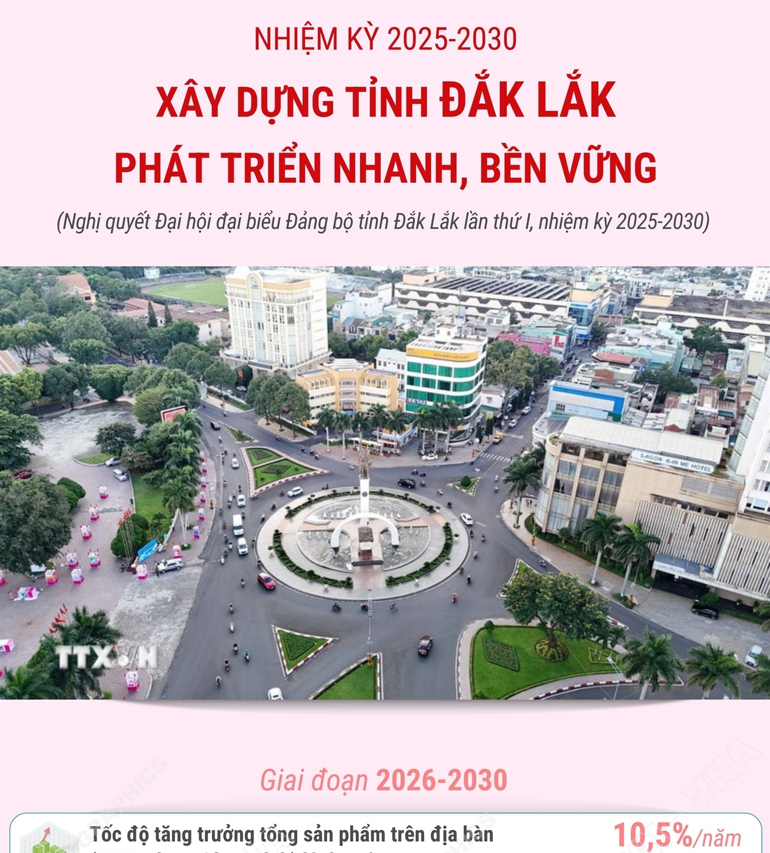 Hà Nội (TTXVN 7/11) Đại hội Đại biểu Đảng bộ tỉnh Đắk Lắk lần thứ I, nhiệm kỳ 2025-2030 đã thông qua Nghị quyết Đại hội, nhất trí mục tiêu, định hướng chiến lược phát triển và nhiệm vụ, giải pháp nhiệm kỳ 2025-2030. Trong nhiệm kỳ mới 2025-2030, tỉnh Đắk Lắk phấn đấu thực hiện thành công các chỉ tiêu chủ yếu như: Tốc độ tăng trưởng tổng sản phẩm trên địa bàn (GRDP theo giá so sánh) bình quân giai đoạn 2026 - 2030 từ 10,5%/năm trở lên; GRDP bình quân đầu người (theo giá hiện hành) đến năm 2030 đạt 153 triệu đồng/người trở lên; tổng vốn đầu tư toàn xã hội trong 5 năm 2026 - 2030 đạt trên 620.000 tỷ đồng, chiếm khoảng 35% trong GRDP theo giá hiện hành; tổng giá trị xuất khẩu trong 5 năm 2026 - 2030 đạt trên 13.000 triệu USD, bình quân tăng 5 - 6%/năm; tổng mức bán lẻ hàng hoá và doanh thu dịch vụ trong 5 năm 2026 - 2030 đạt 1.240.000 tỷ đồng, tăng bình quân khoảng 10%/năm; tổng khách du lịch đến tỉnh trong 5 năm 2026 - 2030 đạt 43 triệu lượt khách, bình quân tăng 10,97%/năm; tổng doanh thu du lịch trong 5 năm 2026 - 2030 đạt 97.150 tỷ đồng, bình quân tăng 14,5%/năm; thu ngân sách nhà nước trên địa bàn (không kể thu tiền sử dụng đất) bình quân tăng từ 11%/năm trở lên; tổng số doanh nghiệp thành lập mới trong 5 năm 2026 - 2030 đạt khoảng 15.500 doanh nghiệp, bình quân tăng 13%/năm; tỷ lệ kết nạp đảng viên mới hằng năm đạt từ 3% - 4% tổng số đảng viên...