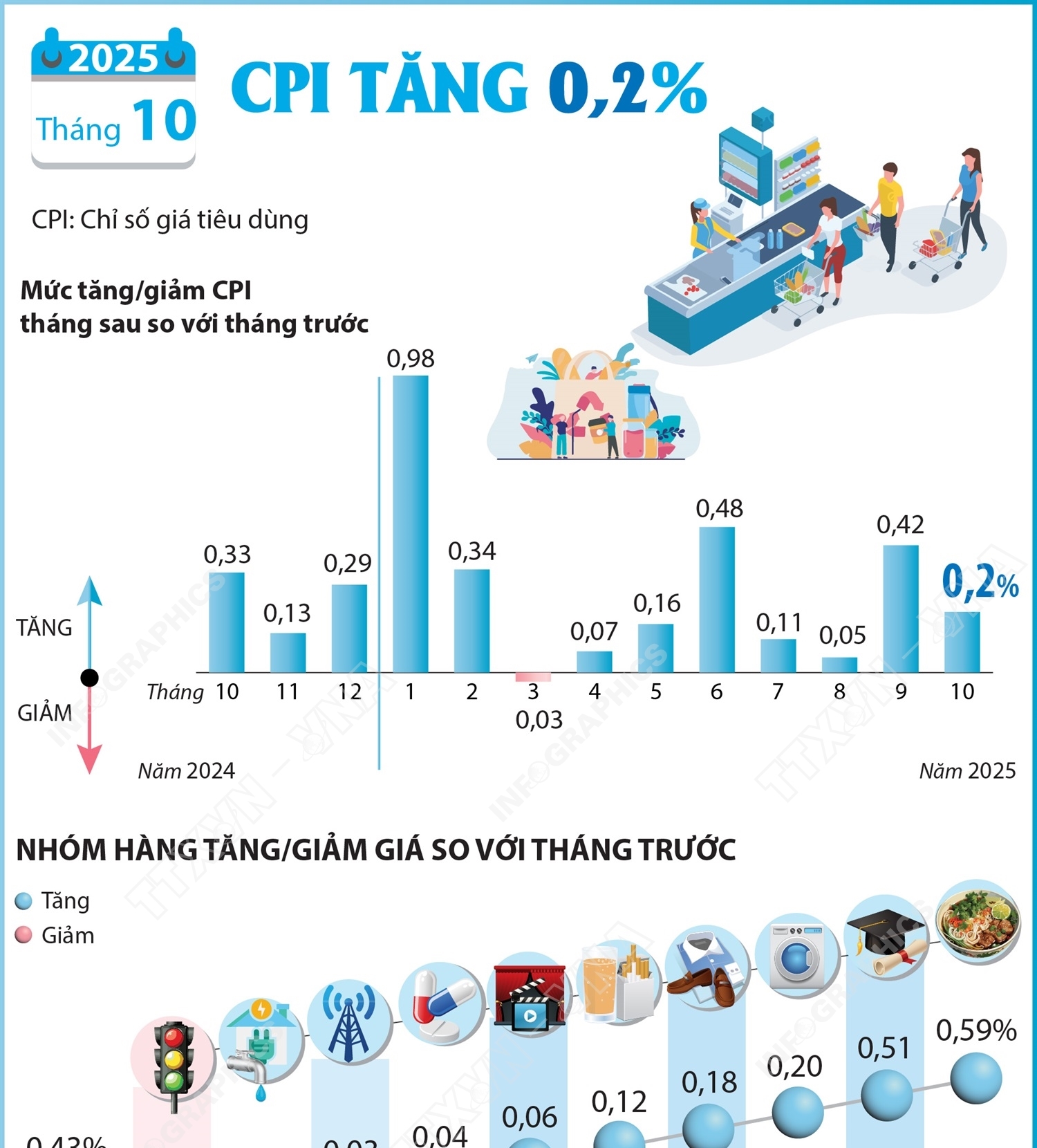 Hà Nội (TTXVN 6/11) Chỉ số giá tiêu dùng (CPI) tháng 10/2025 tăng 0,2% so với tháng trước. Trong đó, có 10 nhóm hàng hóa và dịch vụ có chỉ số giá tăng; riêng chỉ số giá nhóm giao thông giảm.