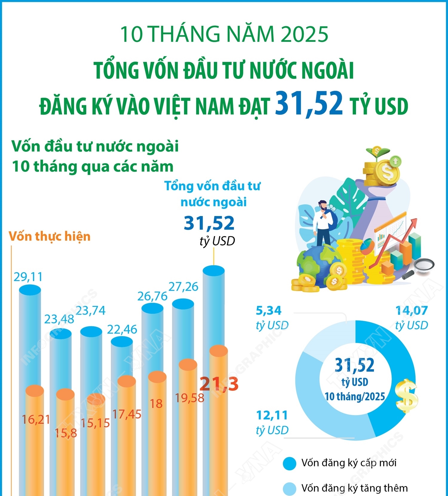 Hà Nội (TTXVN 7/11) 10 tháng năm 2025, tổng vốn đầu tư nước ngoài đăng ký vào Việt Nam tính đến ngày 31/10/2025 bao gồm: Vốn đăng ký cấp mới, vốn đăng ký điều chỉnh và giá trị góp vốn, mua cổ phần của nhà đầu tư nước ngoài đạt 31,52 tỷ USD, tăng 15,6% so với cùng kỳ năm trước.