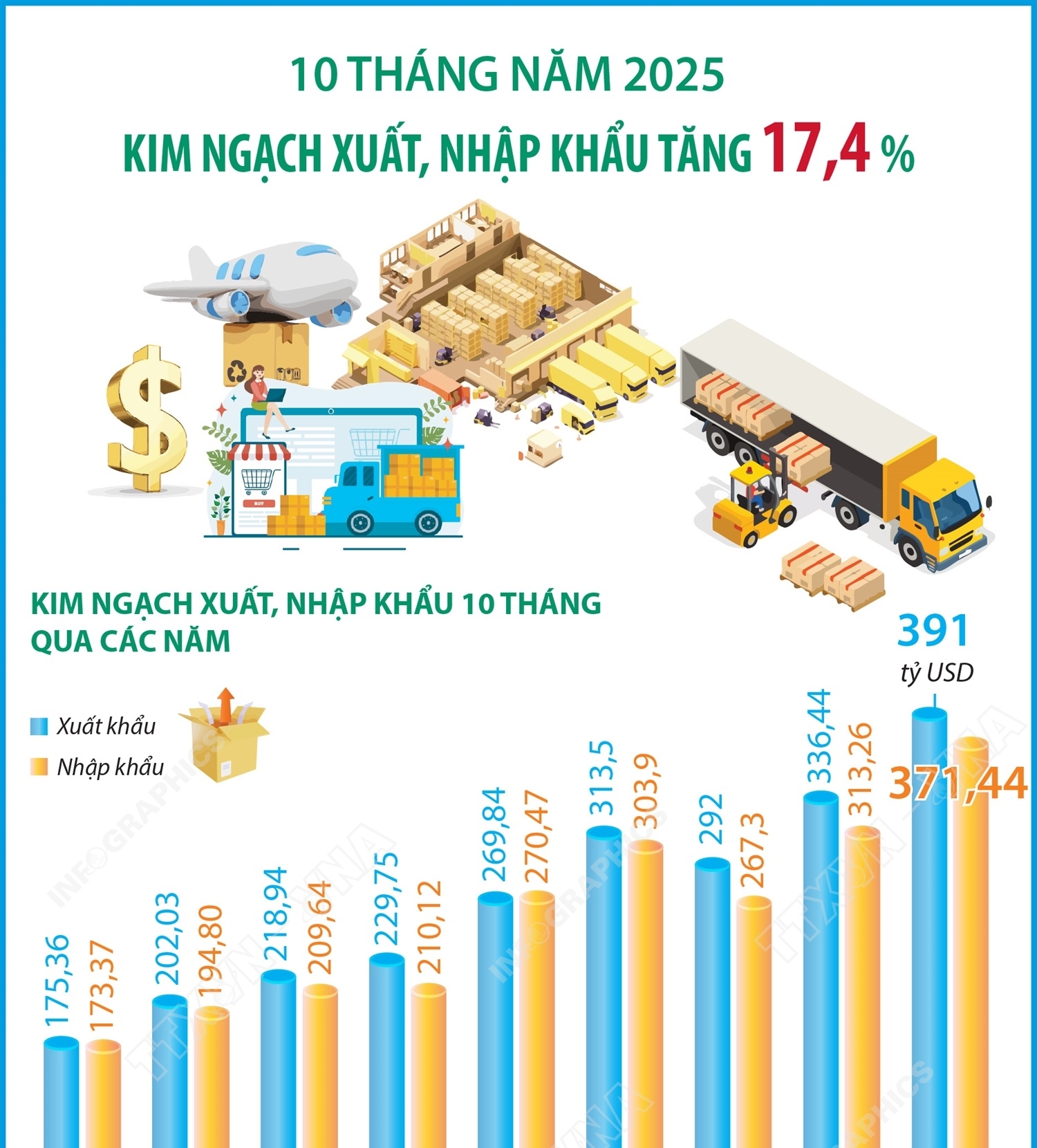 Hà Nội (TTXVN 7/11) 10 tháng năm 2025, tổng kim ngạch xuất, nhập khẩu hàng hóa đạt 762,44 tỷ USD, tăng 17,4% so với cùng kỳ năm trước, trong đó xuất khẩu tăng 16,2% và nhập khẩu tăng 18,6%. Cán cân thương mại hàng hóa xuất siêu 19,56 tỷ USD.