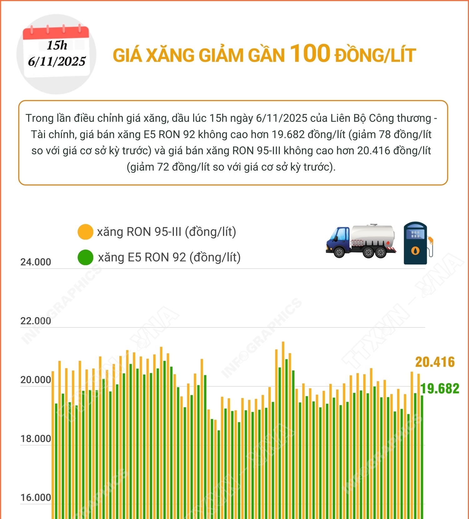 Hà Nội (TTXVN 6/11) Trong lần điều chỉnh giá xăng, dầu lúc 15h ngày 6/11/2025 của Liên Bộ Công thương - Tài chính, giá bán xăng E5 RON 92 không cao hơn 19.682 đồng/lít (giảm 78 đồng/lít so với giá cơ sở kỳ trước) và giá bán xăng RON 95-III không cao hơn 20.416 đồng/lít (giảm 72 đồng/lít so với giá cơ sở kỳ trước).