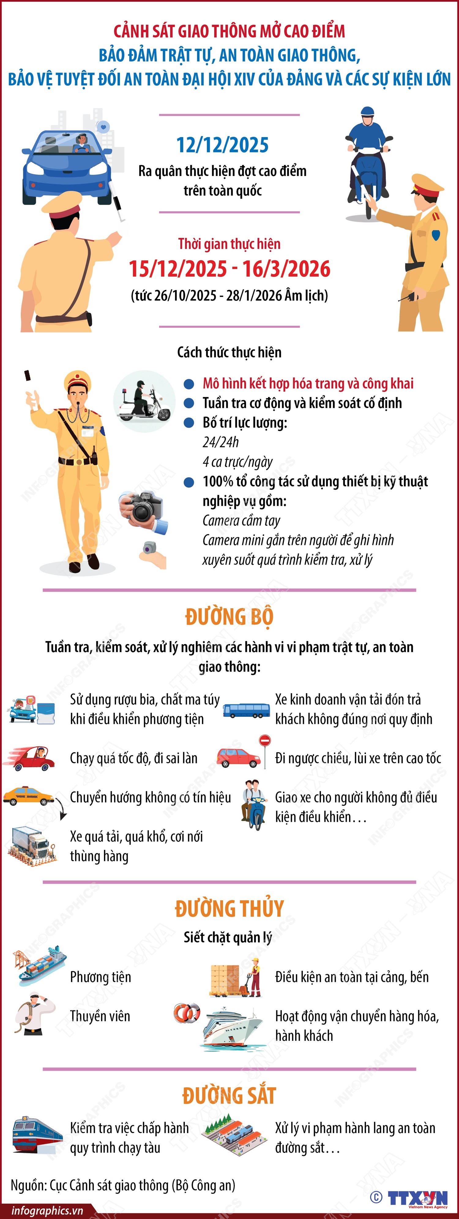 Hà Nội (TTXVN 13/12) Thực hiện chỉ đạo của Bộ trưởng Bộ Công an về mở đợt cao điểm tấn công, trấn áp tội phạm, Cục Cảnh sát giao thông vừa ban hành Kế hoạch cao điểm bảo đảm trật tự, an toàn giao thông góp phần bảo vệ tuyệt đối an ninh, an toàn Đại hội đại biểu toàn quốc lần thứ XIV của Đảng; bầu cử đại biểu Quốc hội khóa XVI, HĐND các cấp nhiệm kỳ 2026-2031; Tết Dương lịch, Tết Nguyên đán Bính Ngọ; các sự kiện lớn của đất nước và các lễ hội đầu năm 2026. Sáng 12/12/2025, Cảnh sát giao thông các đơn vị, địa phương đồng loạt ra quân thực hiện đợt cao điểm. Thời gian thực hiện trong 3 tháng, từ ngày 15/12/2025 đến 16/3/2026 (tức từ ngày 26/10/2025 đến ngày 28/01/2026 âm lịch). Mục tiêu đặt ra là không để xảy ra điểm nóng, bảo đảm tuyệt đối an toàn cho các sự kiện chính trị, kinh tế, văn hóa quan trọng diễn ra trong năm 2026.