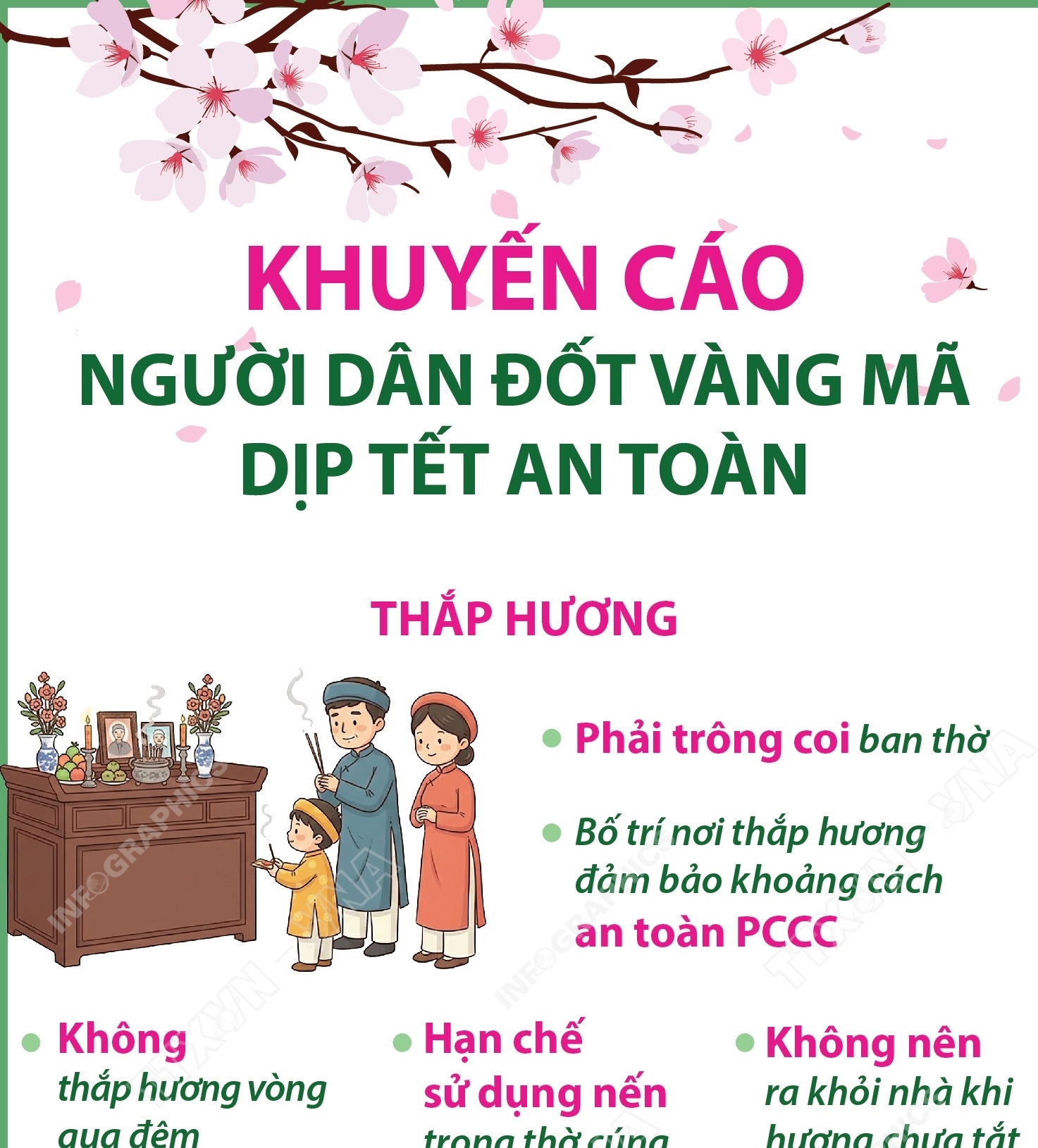 Hà Nội (TTXVN 16/2) Dịp đầu xuân là lúc thời tiết thay đổi, trời hanh khô, nguy cơ xảy ra cháy, nổ rất cao. Đặc biệt, việc thắp hương, đốt vàng mã tại các đình, chùa, miếu, nơi tổ chức các hoạt động lễ, hội để thờ cúng… và hộ gia đình sẽ gia tăng, tiềm ẩn nhiều nguy cơ gây cháy, nổ. Để hạn chế tối đa nguy cơ xảy ra cháy, nổ và bảo đảm an toàn PCCC khi thắp hương thờ cúng, đốt vàng mã, phải có người trông coi, đúng nơi quy định, không đốt quá nhiều, phải chờ vàng mã cháy hết rồi dùng nước vẩy lên gio...