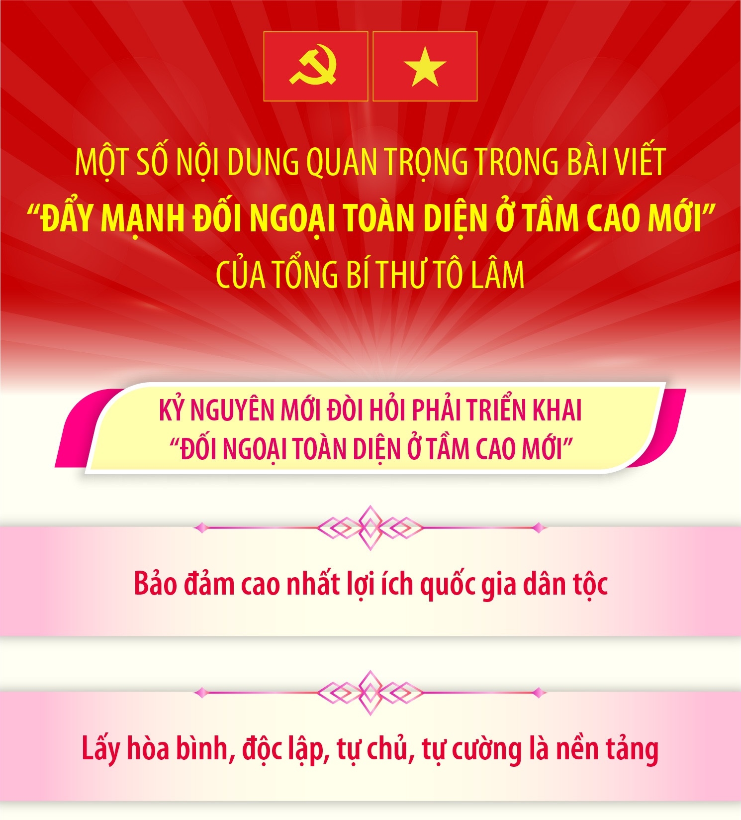 Hà Nội (TTXVN 18/2) Bài viết của Tổng Bí thư Tô Lâm "ĐẨY MẠNH ĐỐI NGOẠI TOÀN DIỆN Ở TẦM CAO MỚI" nhấn mạnh: Đứng trước những thời khắc lịch sử, đất nước cần có những quyết sách lịch sử. Kỷ nguyên mới đòi hỏi phải triển khai “đối ngoại toàn diện ở tầm cao mới”: Bảo đảm cao nhất lợi ích quốc gia dân tộc; lấy hòa bình, độc lập, tự chủ, tự cường là nền tảng; đặt người dân là trung tâm của mọi chính sách; coi đóng góp cho cộng đồng quốc tế là trách nhiệm. Ở tầm cao mới, đối ngoại sẽ được triển khai một cách tự tin, tự chủ, tự lực, tự cường hơn; đóng góp hiệu quả hơn vào những mục tiêu chiến lược của đất nước; thể hiện trách nhiệm lớn hơn đối với hòa bình và phát triển của thế giới.